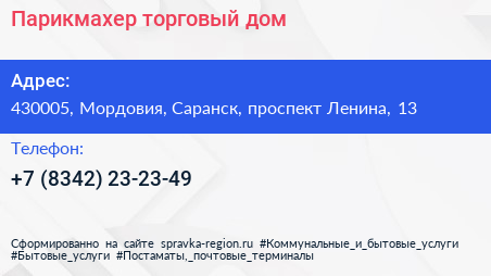 Парикмахер, торговый дом по адресу 430005, Мордовия, Саранск, проспект Ленина, 13 в дальнейшем Организация, размещена в следующих категориях: