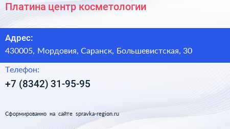 Платина, центр косметологии по адресу 430005, Мордовия, Саранск, Большевистская, 30 в дальнейшем Организация, размещена в следующих категориях: