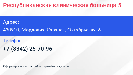 Республиканская клиническая больница №5 по адресу 430910, Мордовия, Саранск, Октябрьская, 6 в дальнейшем Организация, размещена в следующих категориях: