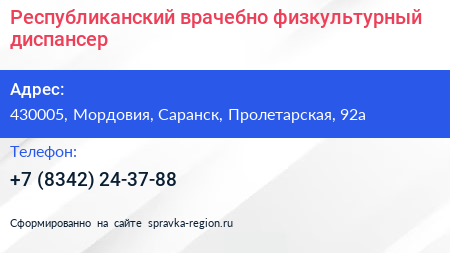 Республиканский врачебно-физкультурный диспансер по адресу 430005, Мордовия, Саранск, Пролетарская, 92а в дальнейшем Организация, размещена в следующих категориях: