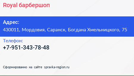 Royal, барбершоп по адресу 430011, Мордовия, Саранск, Богдана Хмельницкого, 75 в дальнейшем Организация, размещена в следующих категориях: