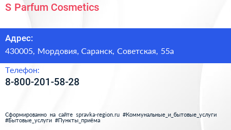 S Parfum & Cosmetics по адресу 430005, Мордовия, Саранск, Советская, 55а в дальнейшем Организация, размещена в следующих категориях: