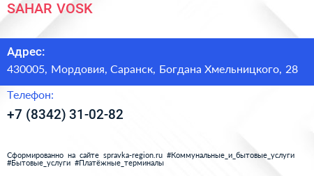 SAHAR & VOSK по адресу 430005, Мордовия, Саранск, Богдана Хмельницкого, 28 в дальнейшем Организация, размещена в следующих категориях: