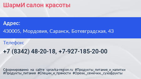 ШармИ, салон красоты по адресу 430005, Мордовия, Саранск, Ботевградская, 43 в дальнейшем Организация, размещена в следующих категориях: