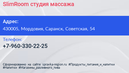 SlimRoom, студия массажа по адресу 430005, Мордовия, Саранск, Советская, 54 в дальнейшем Организация, размещена в следующих категориях: