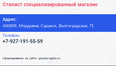 Стилист, специализированный магазин по адресу 430009, Мордовия, Саранск, Волгоградская, 71 в дальнейшем Организация, размещена в следующих категориях:
