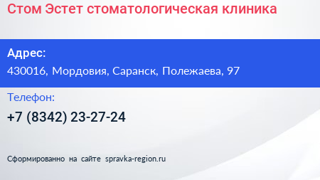Стом-Эстет, стоматологическая клиника по адресу 430016, Мордовия, Саранск, Полежаева, 97 в дальнейшем Организация, размещена в следующих категориях: