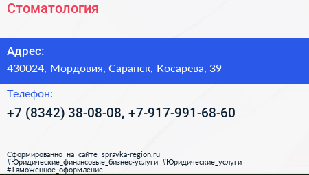 Стоматология по адресу 430024, Мордовия, Саранск, Косарева, 39 в дальнейшем Организация, размещена в следующих категориях: