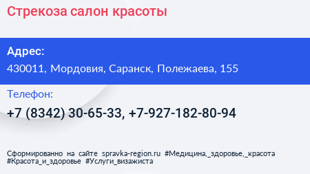 Стрекоза, салон красоты по адресу 430011, Мордовия, Саранск, Полежаева, 155 в дальнейшем Организация, размещена в следующих категориях: