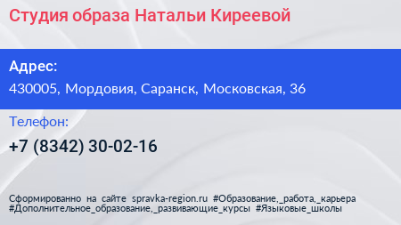 Студия образа Натальи Киреевой по адресу 430005, Мордовия, Саранск, Московская, 36 в дальнейшем Организация, размещена в следующих категориях: