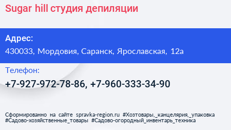 Sugar hill, студия депиляции по адресу 430033, Мордовия, Саранск, Ярославская, 12а в дальнейшем Организация, размещена в следующих категориях: