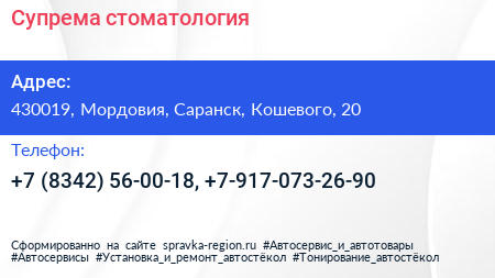 Супрема, стоматология по адресу 430019, Мордовия, Саранск, Кошевого, 20 в дальнейшем Организация, размещена в следующих категориях: