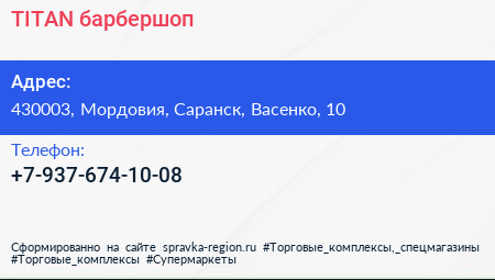 TITAN, барбершоп по адресу 430003, Мордовия, Саранск, Васенко, 10 в дальнейшем Организация, размещена в следующих категориях: