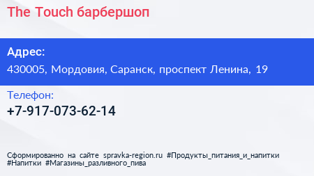 The Touch, барбершоп по адресу 430005, Мордовия, Саранск, проспект Ленина, 19 в дальнейшем Организация, размещена в следующих категориях: