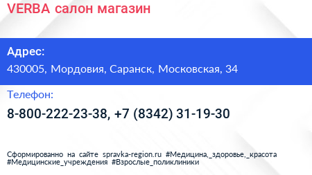 VERBA, салон-магазин по адресу 430005, Мордовия, Саранск, Московская, 34 в дальнейшем Организация, размещена в следующих категориях: