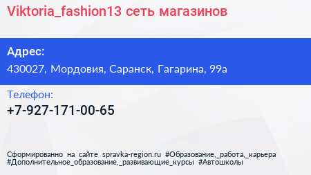 Viktoria_fashion13, сеть магазинов по адресу 430027, Мордовия, Саранск, Гагарина, 99а в дальнейшем Организация, размещена в следующих категориях: