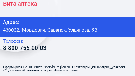 Вита, аптека по адресу 430032, Мордовия, Саранск, Ульянова, 93 в дальнейшем Организация, размещена в следующих категориях: