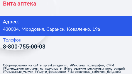 Вита, аптека по адресу 430034, Мордовия, Саранск, Коваленко, 19а в дальнейшем Организация, размещена в следующих категориях: