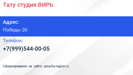 Тату-студия ВИРЬ по адресу Победы 20 в дальнейшем Организация, размещена в следующих категориях: