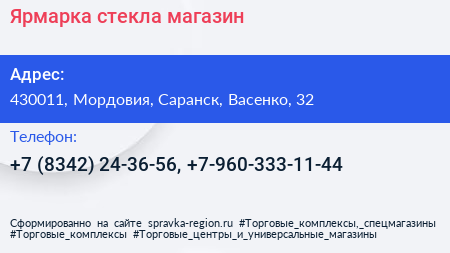 Ярмарка стекла, магазин по адресу 430011, Мордовия, Саранск, Васенко, 32 в дальнейшем Организация, размещена в следующих категориях: