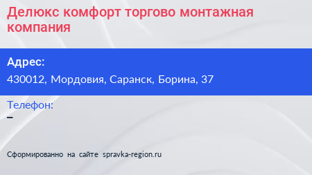 Делюкс-комфорт, торгово-монтажная компания по адресу 430012, Мордовия, Саранск, Борина, 37 в дальнейшем Организация, размещена в следующих категориях: