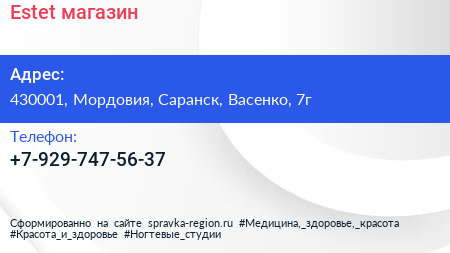 Estet, магазин по адресу 430001, Мордовия, Саранск, Васенко, 7г в дальнейшем Организация, размещена в следующих категориях: