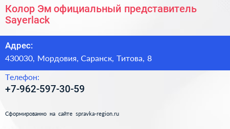 Колор-Эм, официальный представитель Sayerlack по адресу 430030, Мордовия, Саранск, Титова, 8 в дальнейшем Организация, размещена в следующих категориях: