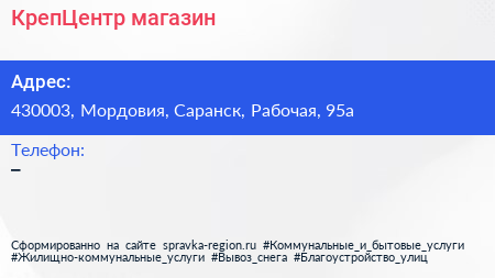 КрепЦентр, магазин по адресу 430003, Мордовия, Саранск, Рабочая, 95а в дальнейшем Организация, размещена в следующих категориях: