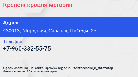 Крепеж кровля, магазин по адресу 430013, Мордовия, Саранск, Победы, 26 в дальнейшем Организация, размещена в следующих категориях: