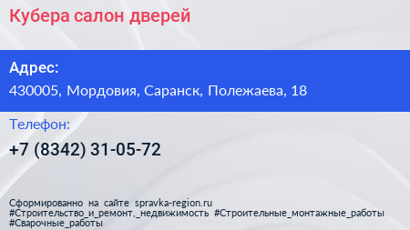 Кубера, салон дверей по адресу 430005, Мордовия, Саранск, Полежаева, 18 в дальнейшем Организация, размещена в следующих категориях: