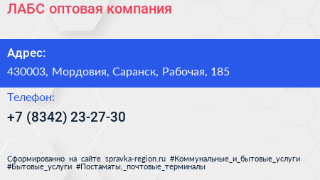 ЛАБС, оптовая компания по адресу 430003, Мордовия, Саранск, Рабочая, 185 в дальнейшем Организация, размещена в следующих категориях: