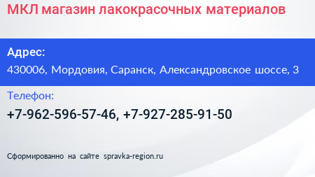 МКЛ, магазин лакокрасочных материалов по адресу 430006, Мордовия, Саранск, Александровское шоссе, 3 в дальнейшем Организация, размещена в следующих категориях: