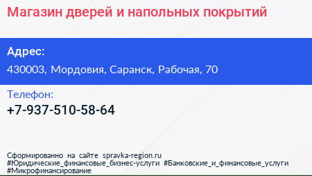 Магазин дверей и напольных покрытий по адресу 430003, Мордовия, Саранск, Рабочая, 70 в дальнейшем Организация, размещена в следующих категориях: