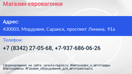 Магазин евровагонки по адресу 430003, Мордовия, Саранск, проспект Ленина, 91а в дальнейшем Организация, размещена в следующих категориях:
