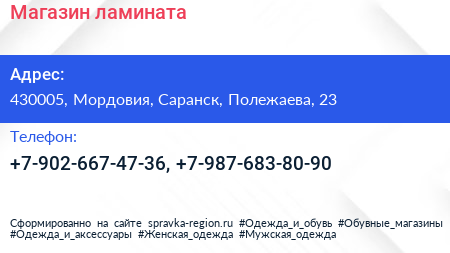 Магазин ламината по адресу 430005, Мордовия, Саранск, Полежаева, 23 в дальнейшем Организация, размещена в следующих категориях: