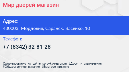 Мир дверей, магазин по адресу 430003, Мордовия, Саранск, Васенко, 10 в дальнейшем Организация, размещена в следующих категориях:
