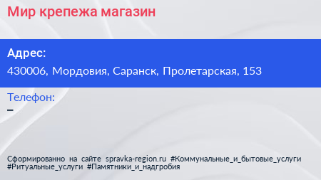 Мир крепежа, магазин по адресу 430006, Мордовия, Саранск, Пролетарская, 153 в дальнейшем Организация, размещена в следующих категориях: