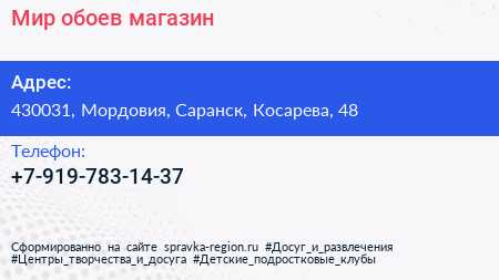Мир обоев, магазин по адресу 430031, Мордовия, Саранск, Косарева, 48 в дальнейшем Организация, размещена в следующих категориях: