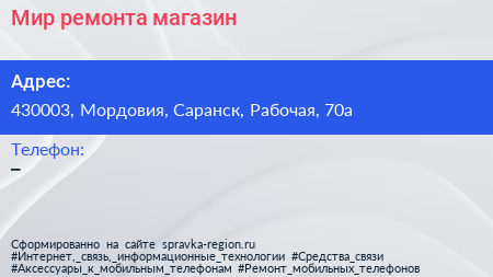 Мир ремонта, магазин по адресу 430003, Мордовия, Саранск, Рабочая, 70а в дальнейшем Организация, размещена в следующих категориях: