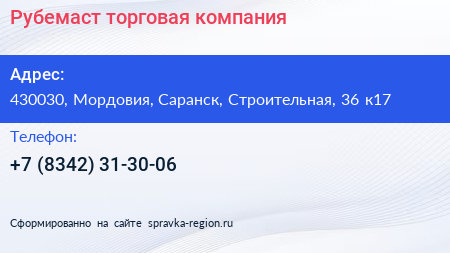Рубемаст, торговая компания по адресу 430030, Мордовия, Саранск, Строительная, 36 к17 в дальнейшем Организация, размещена в следующих категориях: