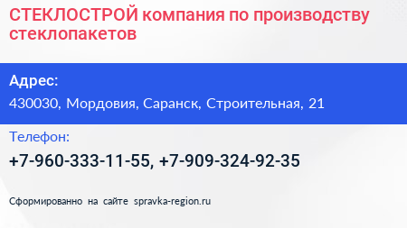 СТЕКЛОСТРОЙ, компания по производству стеклопакетов по адресу 430030, Мордовия, Саранск, Строительная, 21 в дальнейшем Организация, размещена в следующих категориях: