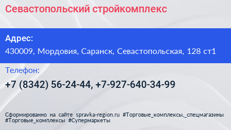 Севастопольский, стройкомплекс по адресу 430009, Мордовия, Саранск, Севастопольская, 128 ст1 в дальнейшем Организация, размещена в следующих категориях: