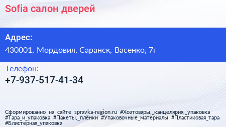 Sofia, салон дверей по адресу 430001, Мордовия, Саранск, Васенко, 7г в дальнейшем Организация, размещена в следующих категориях: