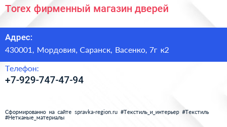 Torex, фирменный магазин дверей по адресу 430001, Мордовия, Саранск, Васенко, 7г к2 в дальнейшем Организация, размещена в следующих категориях: