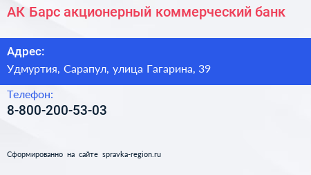 АК Барс, акционерный коммерческий банк по адресу Удмуртия, Сарапул, улица Гагарина, 39 в дальнейшем Организация, размещена в следующих категориях: