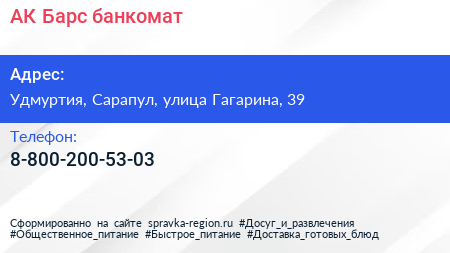 АК Барс, банкомат по адресу Удмуртия, Сарапул, улица Гагарина, 39 в дальнейшем Организация, размещена в следующих категориях: