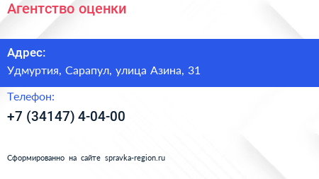 Агентство оценки по адресу Удмуртия, Сарапул, улица Азина, 31 в дальнейшем Организация, размещена в следующих категориях: