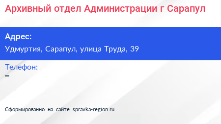Архивный отдел, Администрации г. Сарапул по адресу Удмуртия, Сарапул, улица Труда, 39 в дальнейшем Организация, размещена в следующих категориях: