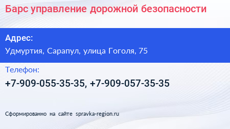 Барс, управление дорожной безопасности по адресу Удмуртия, Сарапул, улица Гоголя, 75 в дальнейшем Организация, размещена в следующих категориях: