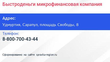 Быстроденьги, микрофинансовая компания по адресу Удмуртия, Сарапул, площадь Свободы, 8 в дальнейшем Организация, размещена в следующих категориях: